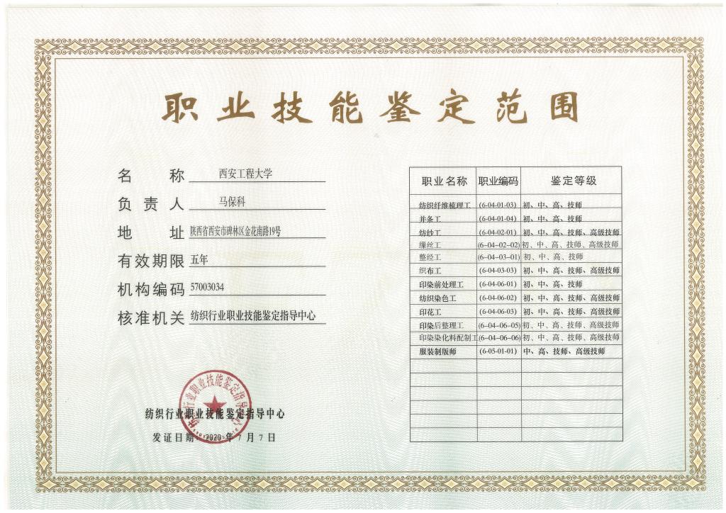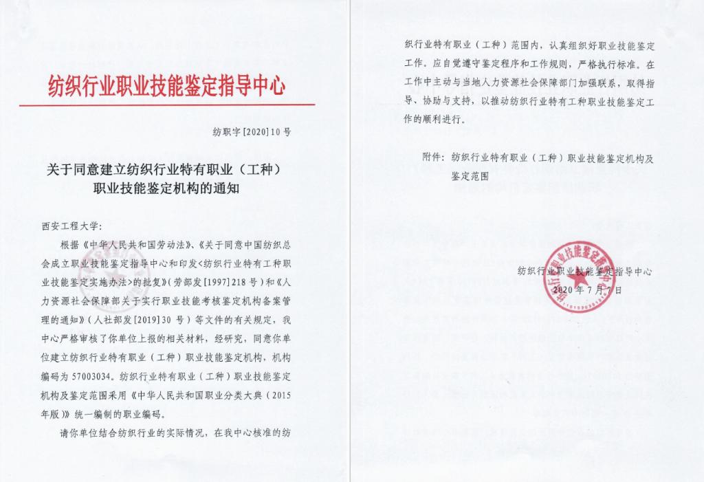 为切实加强我校继续教育人才培养与劳动就业的联系,推进校企合作、产学研结合,充分发挥学校继续教育服务地方经济社会的职能,全面提升纺织行业从业人员的综合素质、职业能力和社会竞争力,根据纺织行业职业技能鉴定指导中心《关于申请设立纺织行业职业技能鉴定机构的通知》(纺职字〔2019〕15号)以及《人力资源和社会保障部关于实行职业技能考核鉴定机构备案管理的通知》(人社部〔2019〕30号)文件精神,我校在充分调研的基础上,结合纺织服装行业的办学特色以及雄厚的师资力量,学校联合我省多家纺织企业,积极组织撰写申报材料,成功获批“纺织行业职业技能鉴定所”,开展陕西境内乃至西北地区纺织服装从业人员职业技能鉴定的组织、考试和协调管理工作。