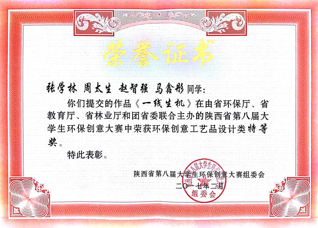 2017年3月24日,陕西省第八届大学生环保创意大赛颁奖典礼在西安培华学院落下帷幕。我校新葡萄8883官网amg官网学生张学林、周太生、赵智强、马鑫彤的参赛作品《一线生机》在新葡萄8883官网amg官网教师胡文哲的指导下获环保创意工艺品设计类特等奖。本次参赛集中反映了新葡萄8883官网amg官网师生关注环保、参与环保的热情和行动,真实展现了新葡萄官网学生的环保创意水平和工艺制作水准。